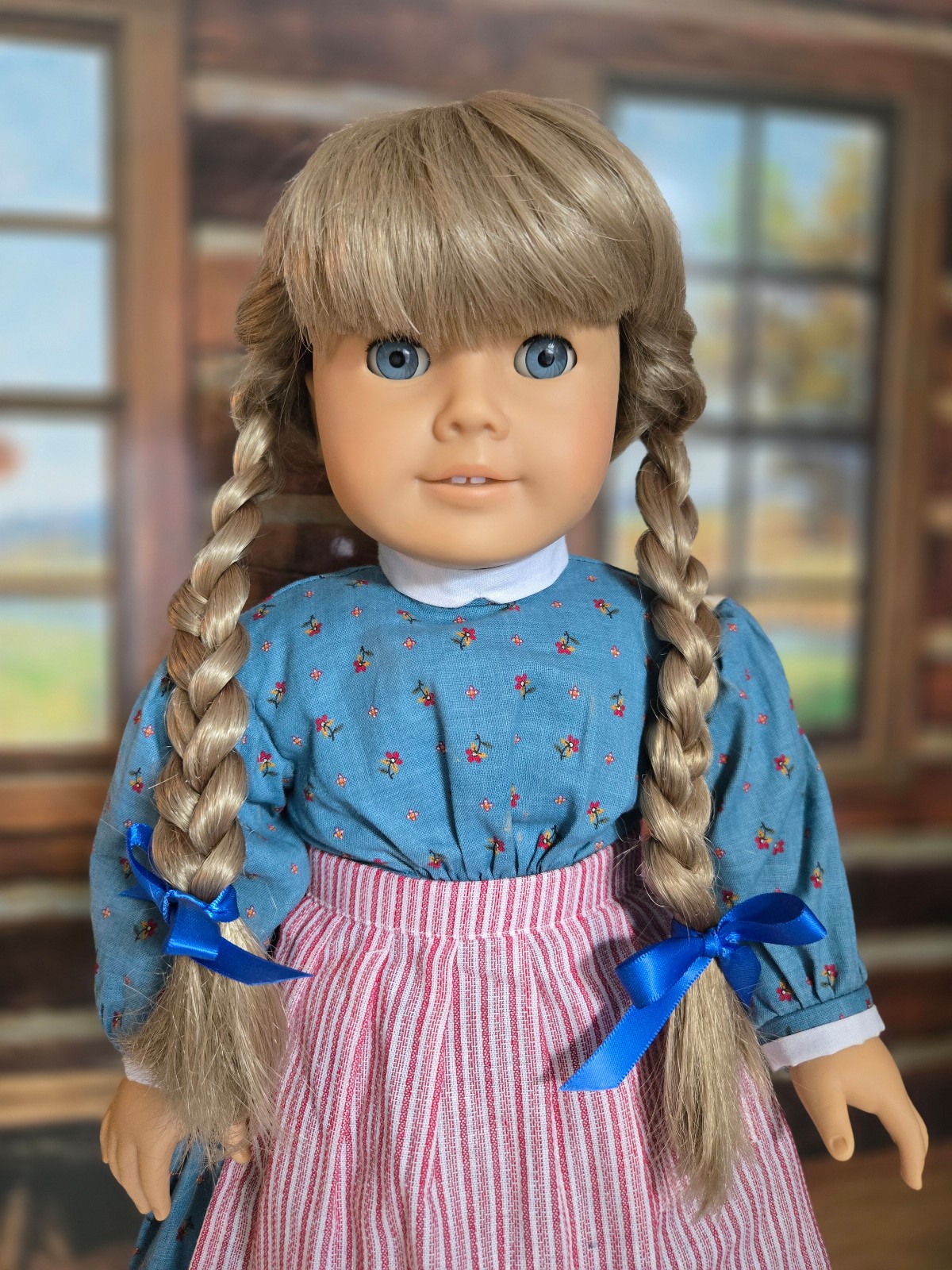 American Girl Pleasant Company Doll Kirsten Larson. She is one of the originals, no tag, larger body. Good condition; tight limbs, hair is soft with shine, body is clean with no odors. Her right eye has a tiny bubble and there is what looks like a faded pencil mark on torso. Included is Pleasant Company petticoat, bloomers, socks, shoes, dress and apron.