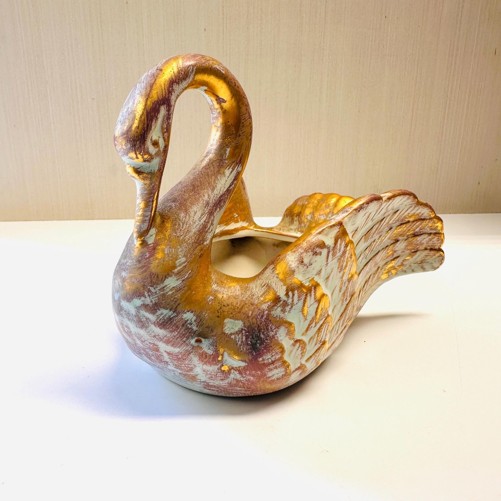Previously owned MCM Stangl pottery swan planter with gold toned finish. There is a maker mark on bottom (see pictures).